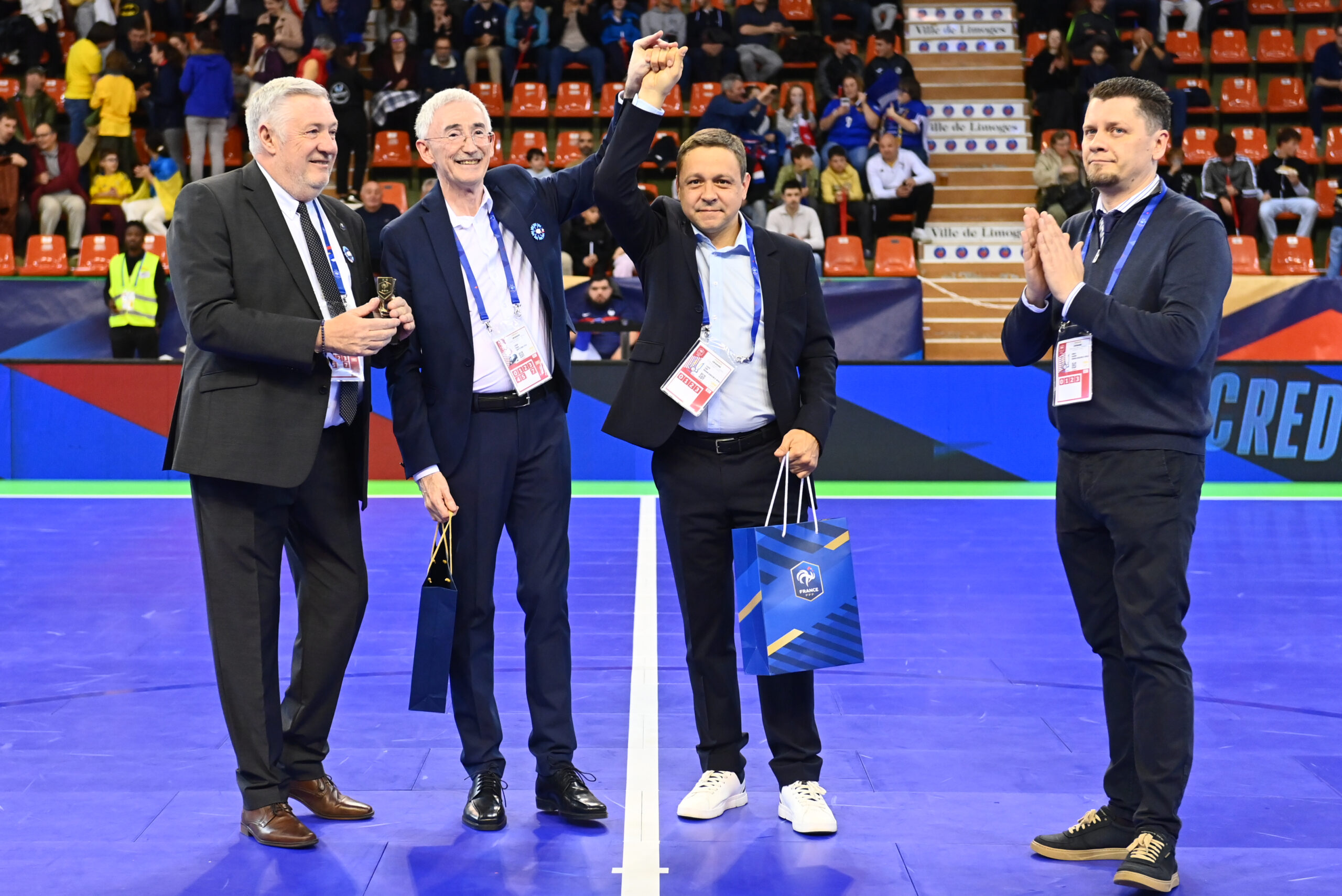 Перед початком товариського матчу представники української делегації вручили французьким колегам символічний подарунок У цей момент у Палаці спорту «Боблан» лунали слова: «За підтримку і допомогу Україні хочемо вручити невеличкий презент, який символізує дружбу між Україною і Францією! Велика подяка Франції!» Франція та Україна – гідні суперники на майданчику та хороші друзі за його межами….