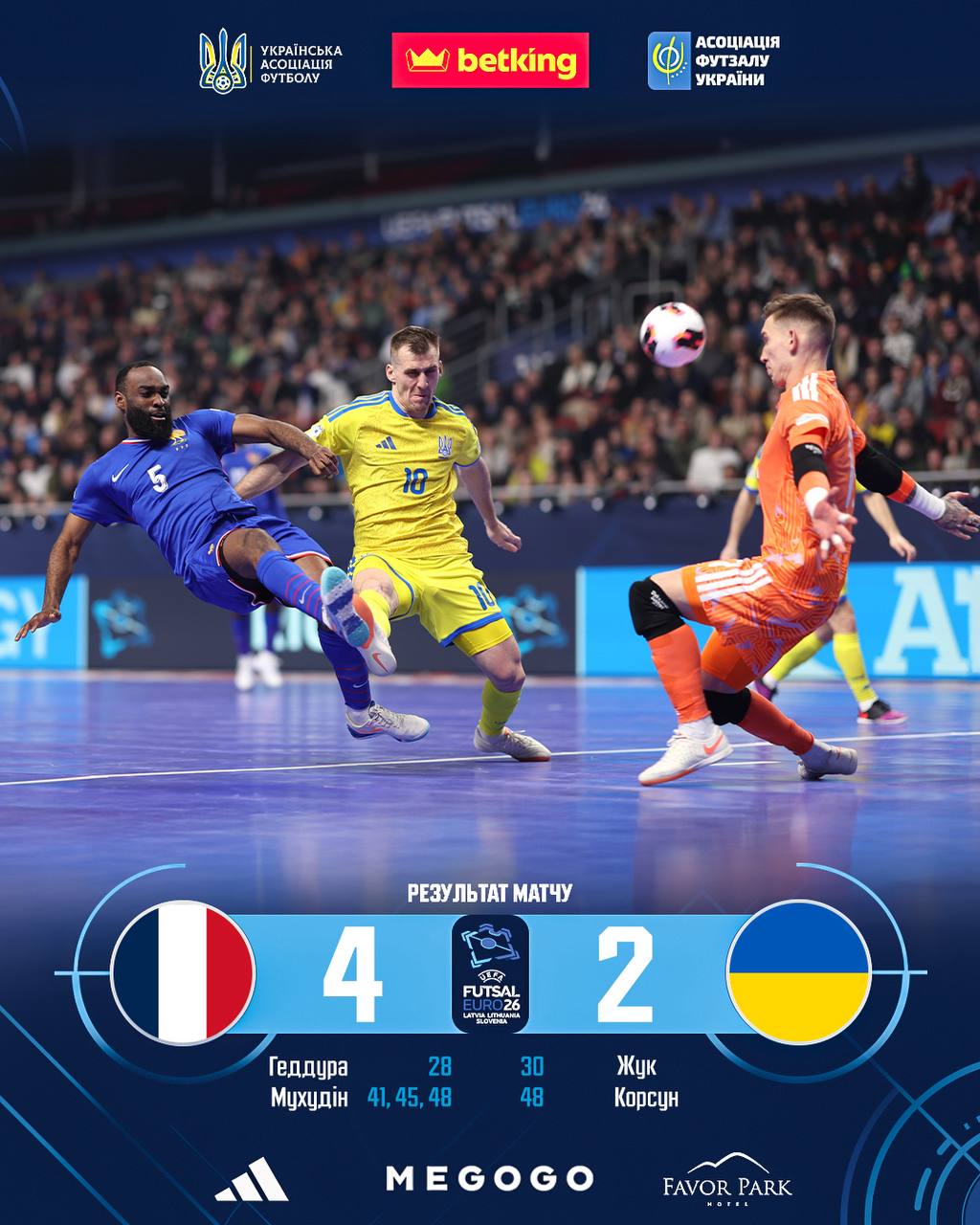 Національна збірна України з футзалу зазнала поразки від Франції у чвертьфіналі Євро-2026 та залишила турнір.