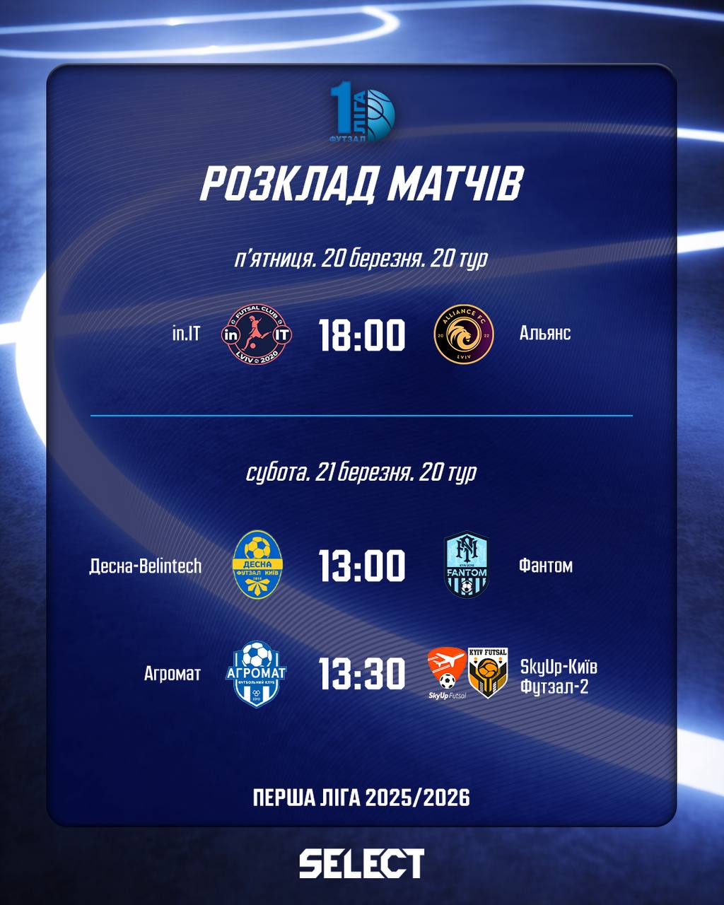 Комітет арбітрів Асоціації футзалу України оприлюднив призначення офіційних осіб на матчі 20-го туру чемпіонату України серед команд Першої ліги сезону 2025/2026 років.