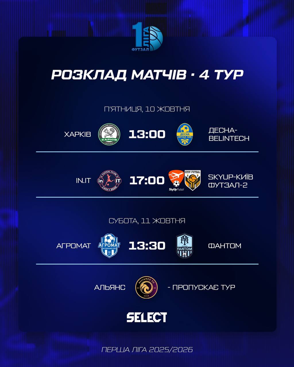 Комітет арбітражу Асоціації футзалу України оприлюднив призначення арбітрів, хронометристів та спостерігачів арбітражу на матчі 4-го туру Першої ліги 2025/26.