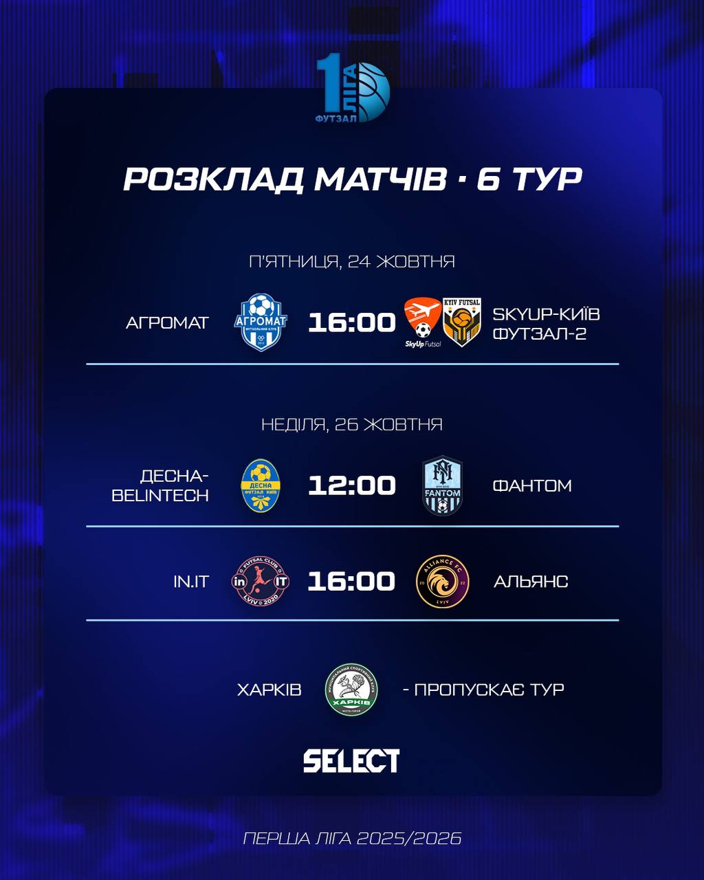 16:00, Київ, спорткомплекс УДУ імені Михайла Драгоманова. «Агромат» (Київ) – «SkyUp Київ Футзал-2»