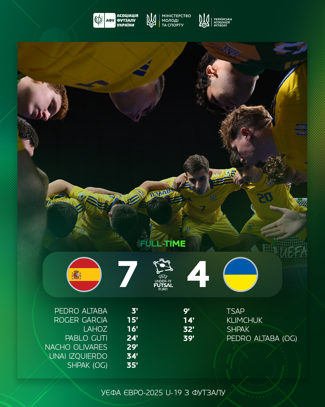 Юнацька збірна України зазнала поразки від Іспанії з рахунком 4:7 у півфіналі Євро-2025 U-19.
